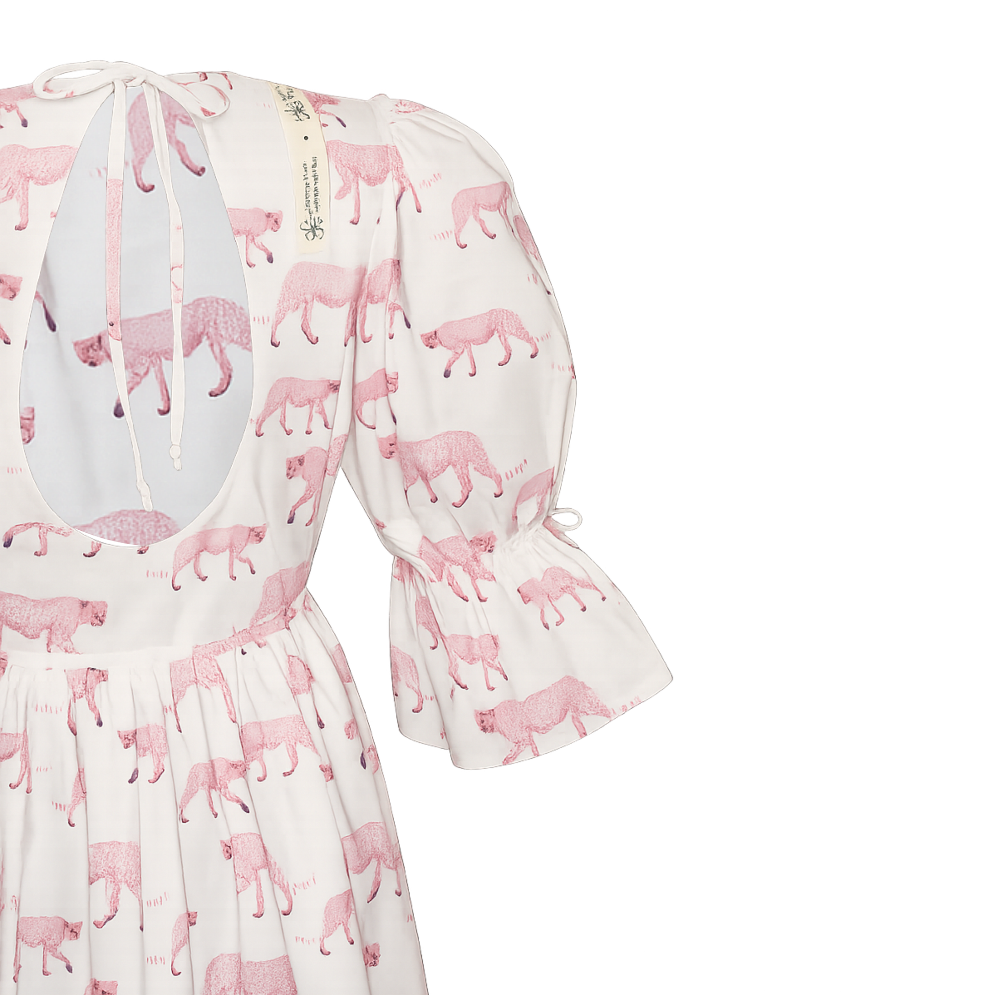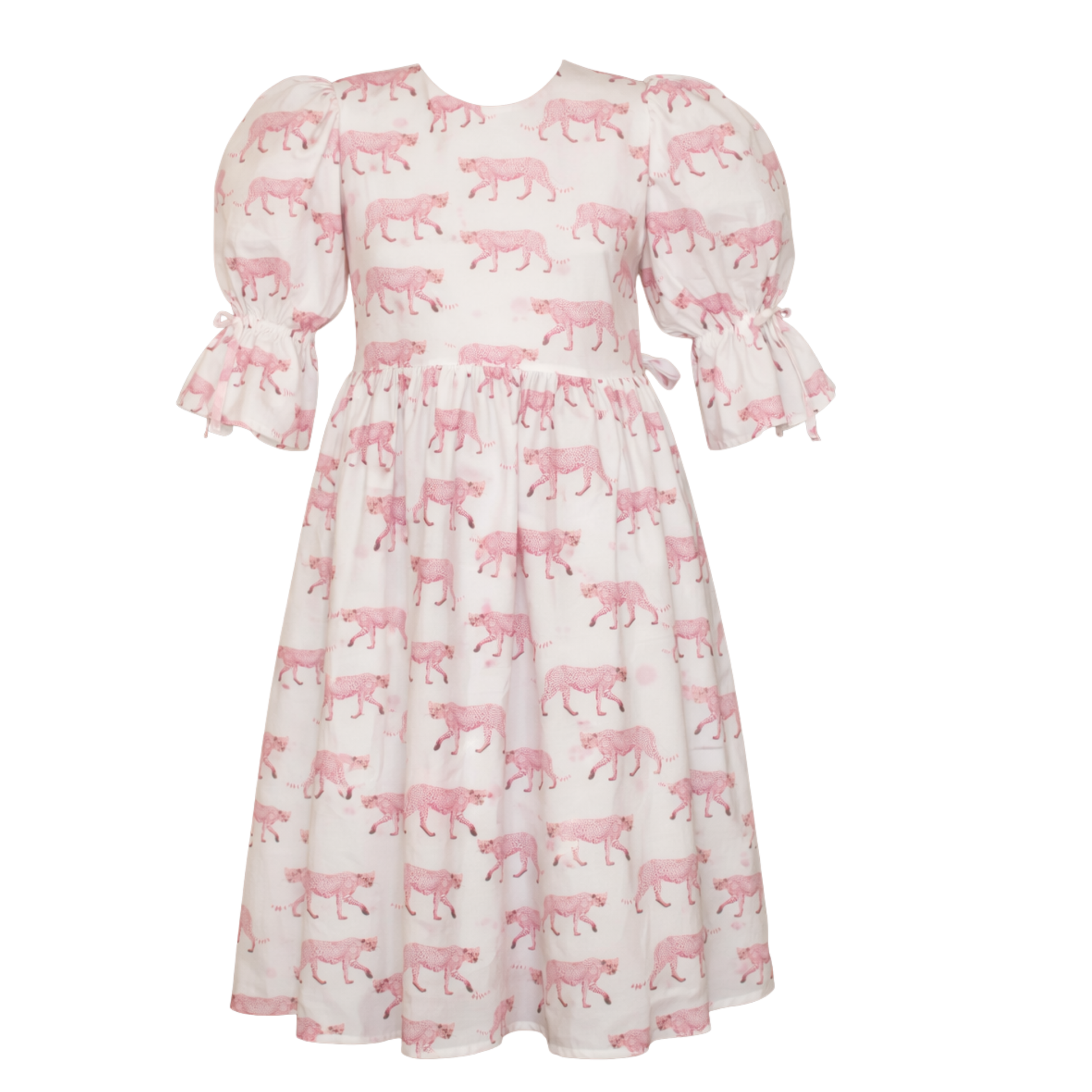 Stunning white and pink dress with adorable pink leopards. Keyhole opening at the back and small bow details. Dress has pockets and lining.